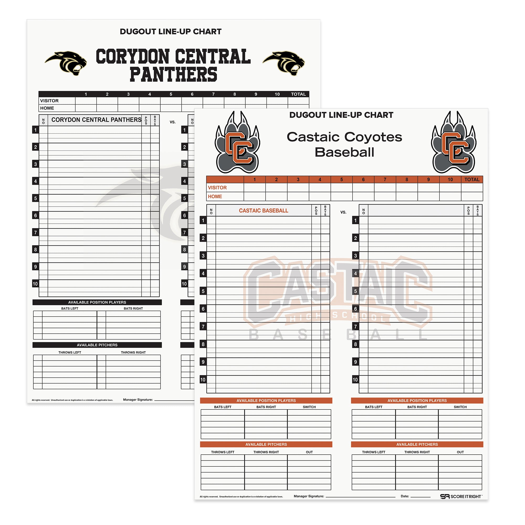 Keep your dugout organized with custom lineup cards. Each pack includes 32 durable sheets, personalized with your team name, logo, and details. Perfect for baseball and softball coaches, these lineup cards are designed to streamline game-day scorekeeping and roster management.